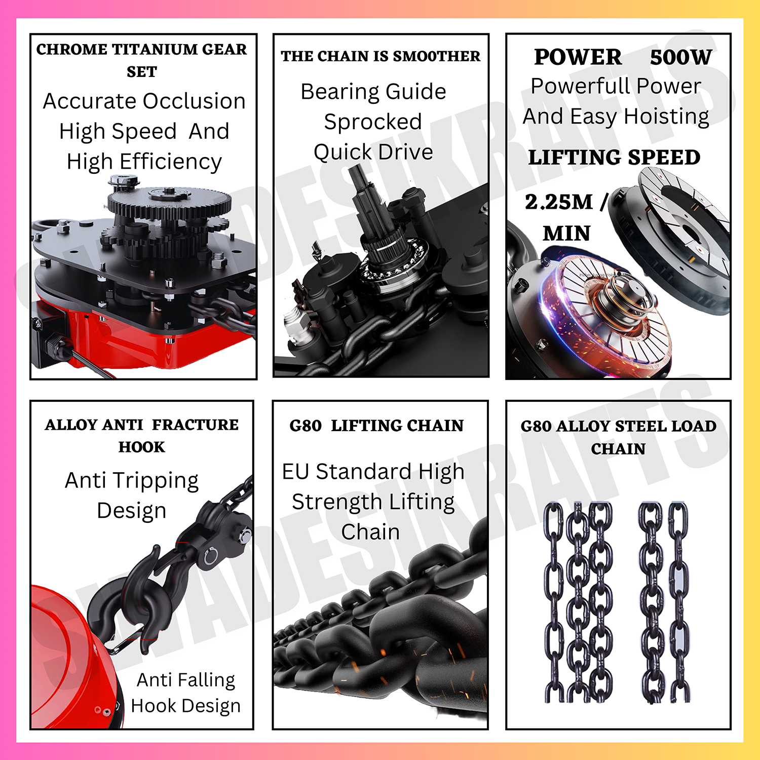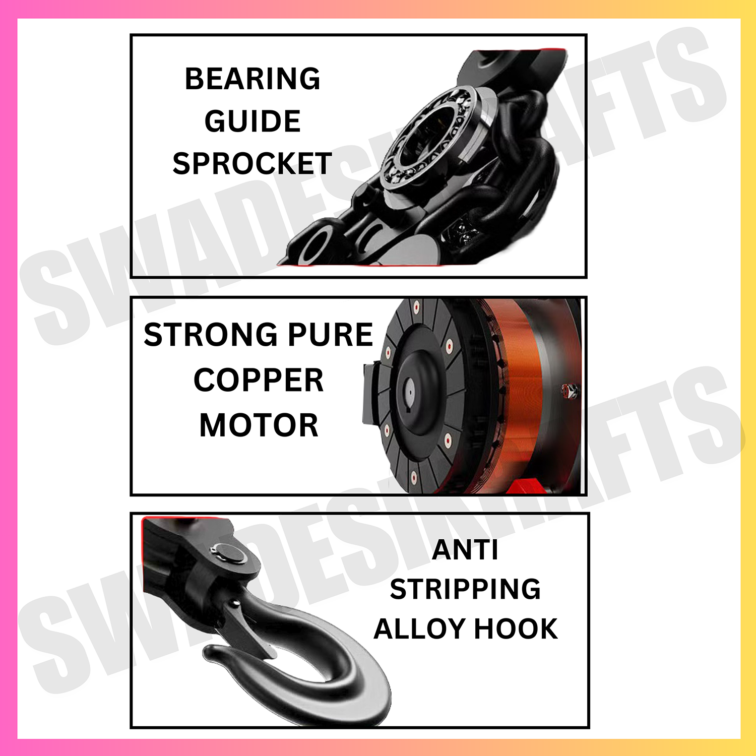SWADESI KRAFTS 2HP DHY Three phase Electric Chain Hoist 1 Ton Capacity Heavy Duty Single Fall Working Height 3meter Load Chain 8mm Lifting Speed 2.25 meter/min with 500w Motorized Chain Pulley Block.
