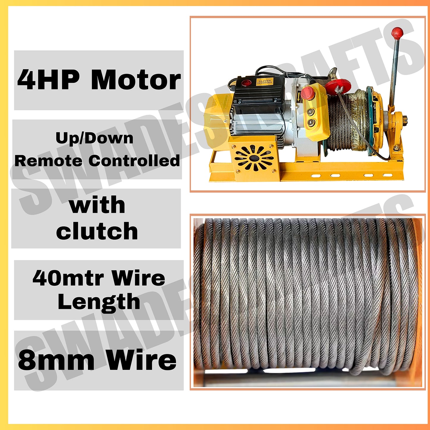 SWADESI KRAFTS Electric Mini Lifting Crane with 4HP Electric Motor & Single Trolly | 8mm Wire Thickness | 40 Meter Length of the Wire and 57kg with 360 Adjustable Frame | Mini Crane Scale 500kg