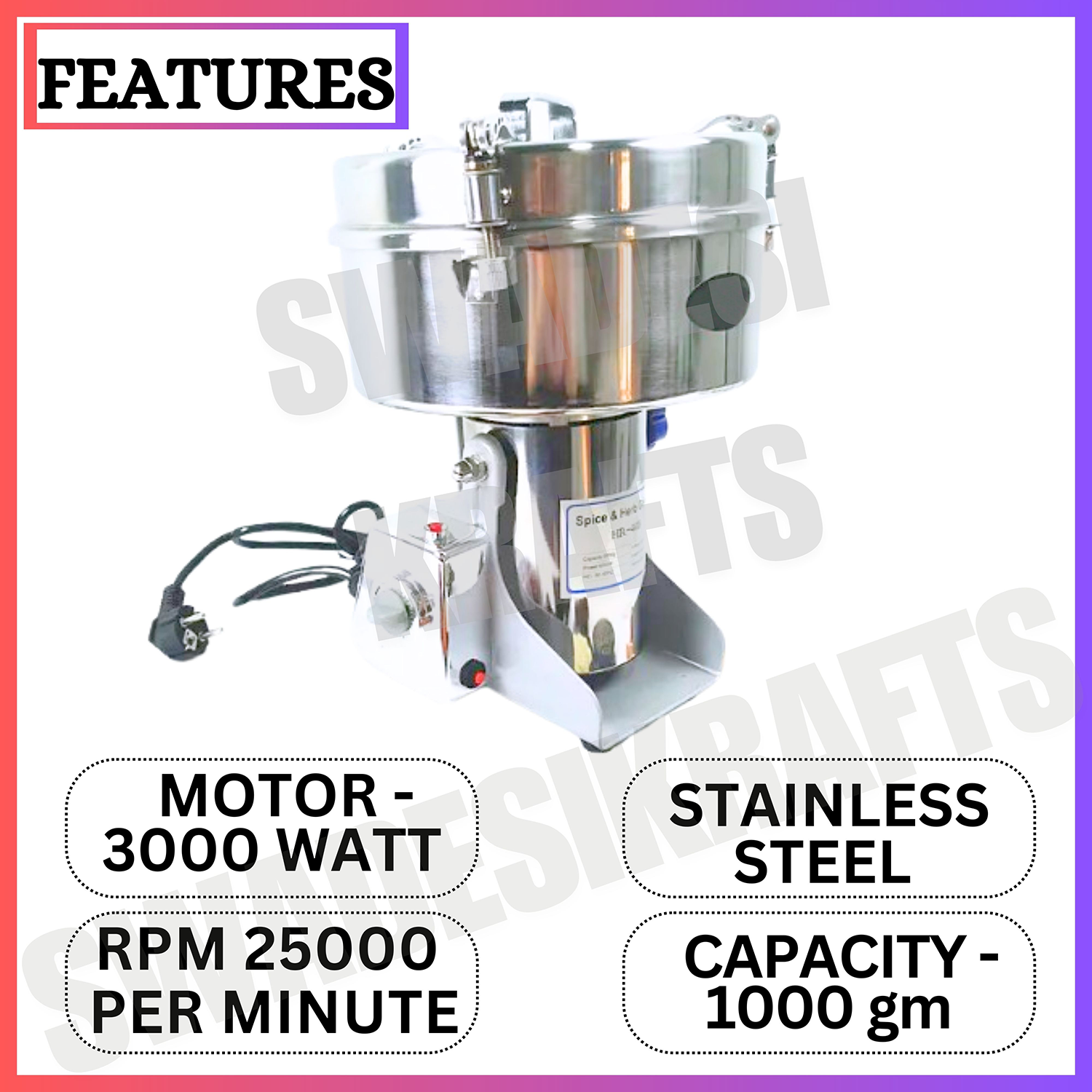 SWADESI KRAFTS Instant Masala Grinder Stainless Steel Body with 3000-Watt Motor Commercial Spice Grinder Size 9.5”X10”X16” Inch (LXWXH) is Used to Grinding Spices